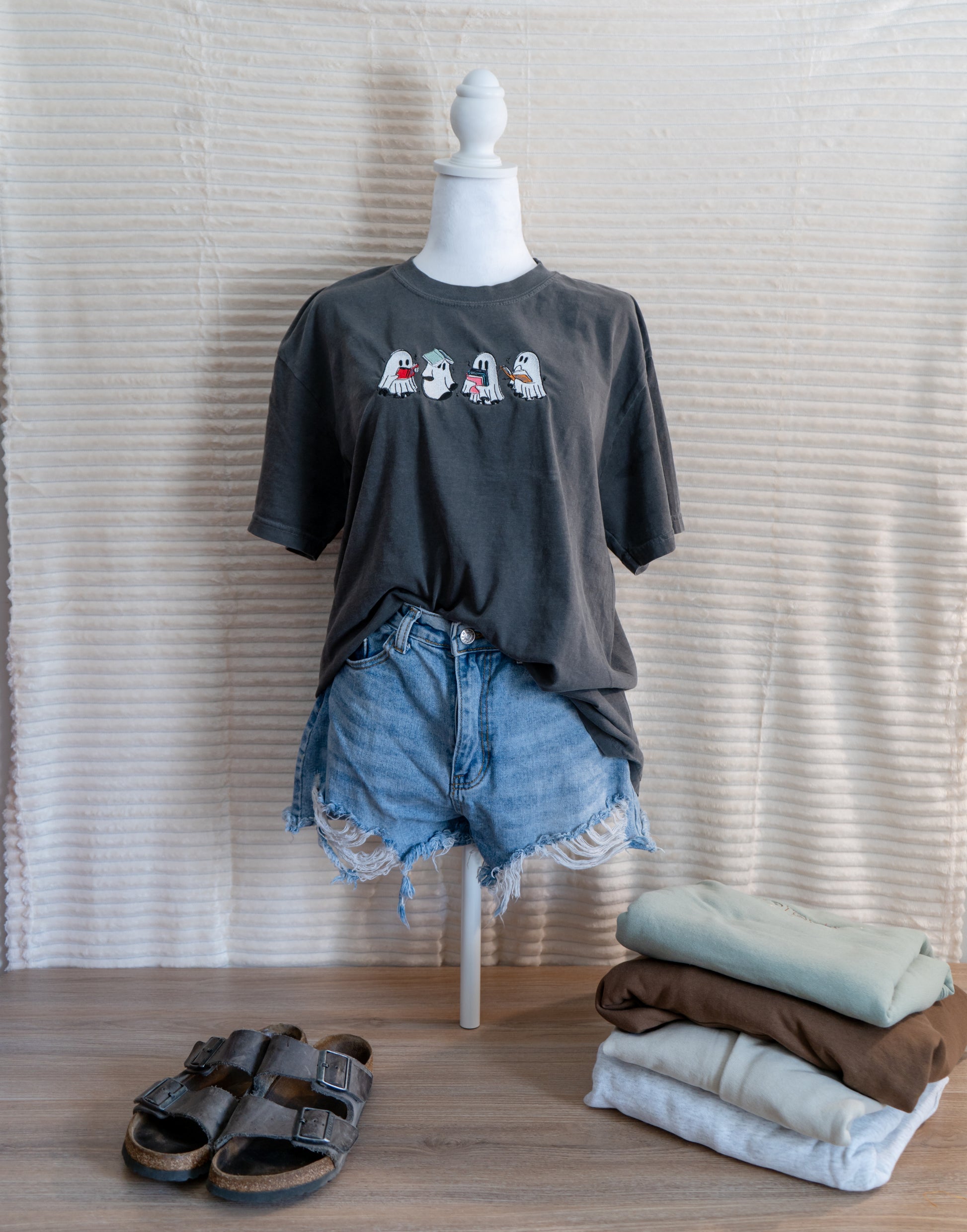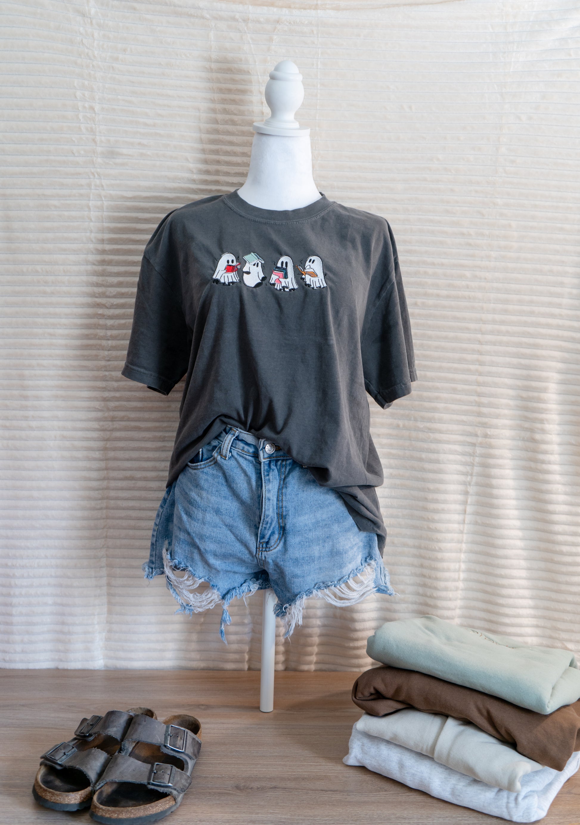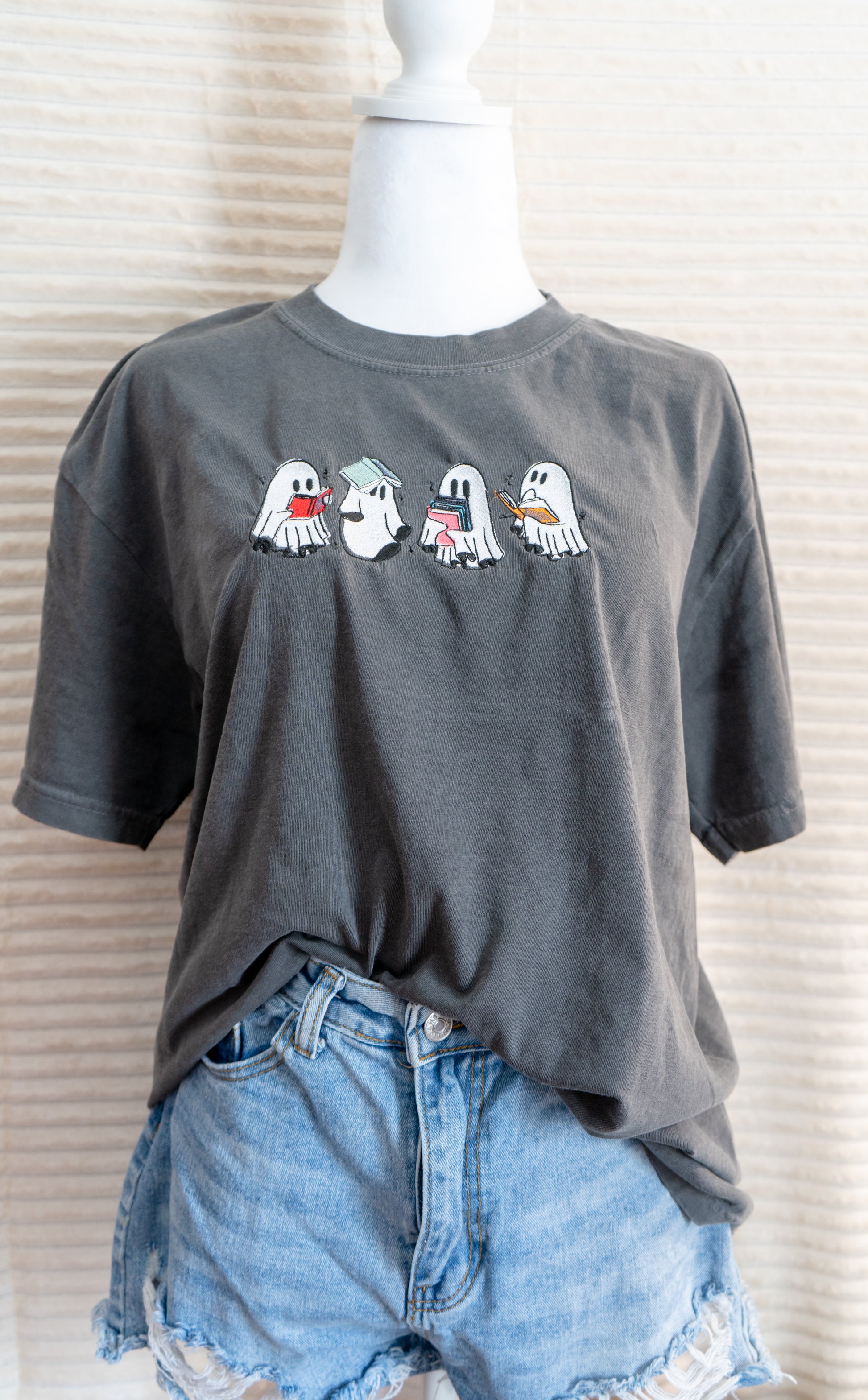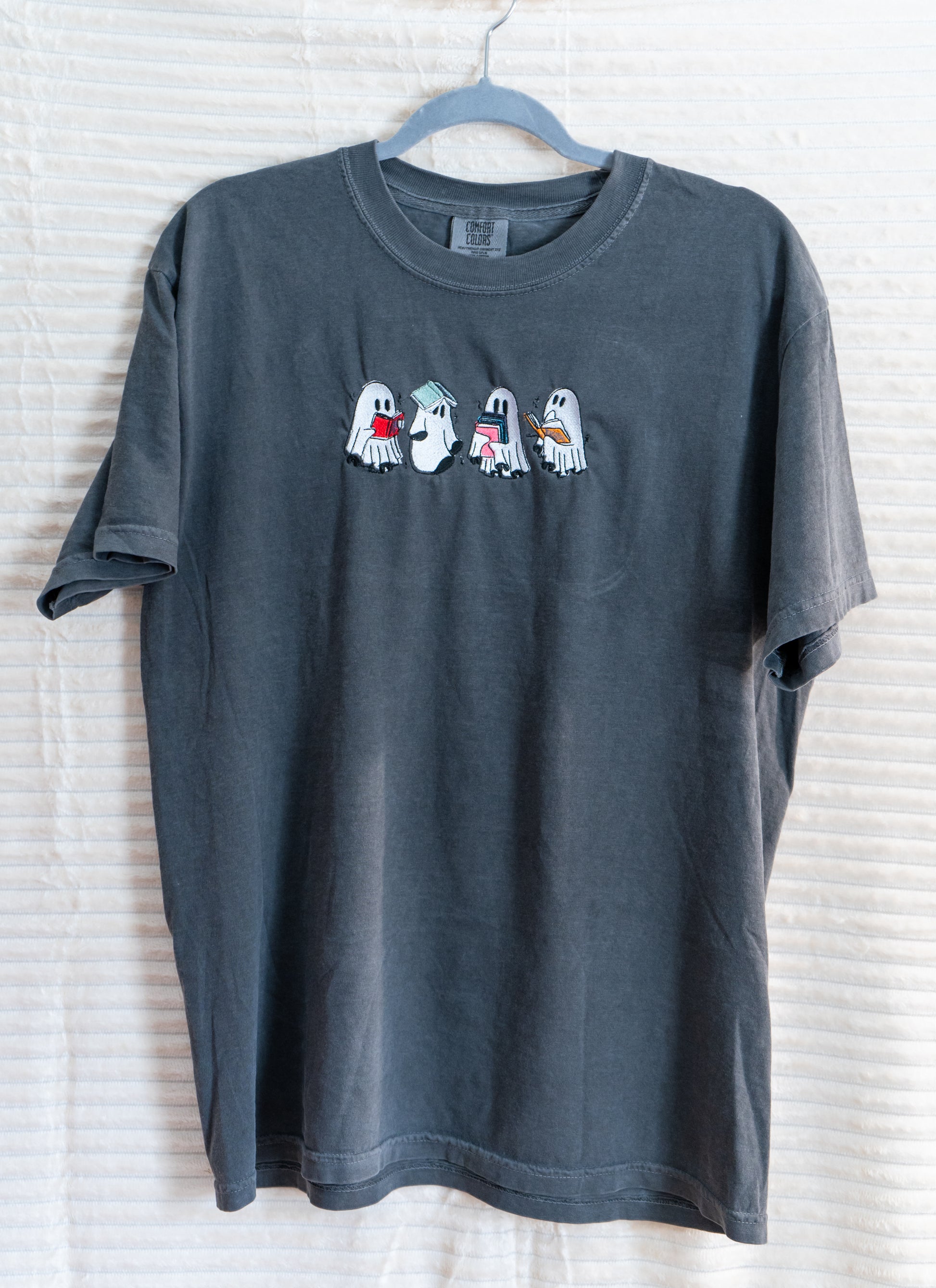 This is our ghost reading embroidered shirt with cute ghost doing one of our personal favorite things reading,avalible in multiple styles and colors, if you don't see a size or color that you want please feel free to contact me to see what we can do!