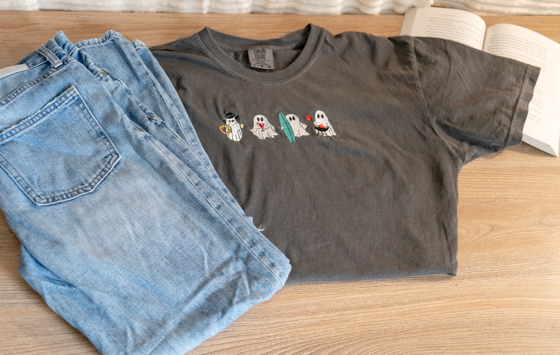 This is our "summerween" embroidered shirt with cute ghost doing summer things, avalible in multiple styles and colors, if you don't see a size or color that you want please feel free to contact me to see what we can do!